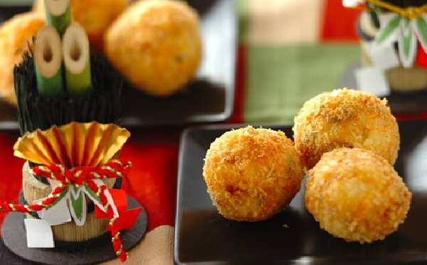 刻んだお煮しめをジャガイモに混ぜて作る、コロッケアレンジです。これなら子どもでもお煮しめを味わえると大好評! お煮しめは刻む前にしっかりと汁気を切りましょう。茹でたジャガイモは熱くて柔らかいうちにつぶすと楽チンです。