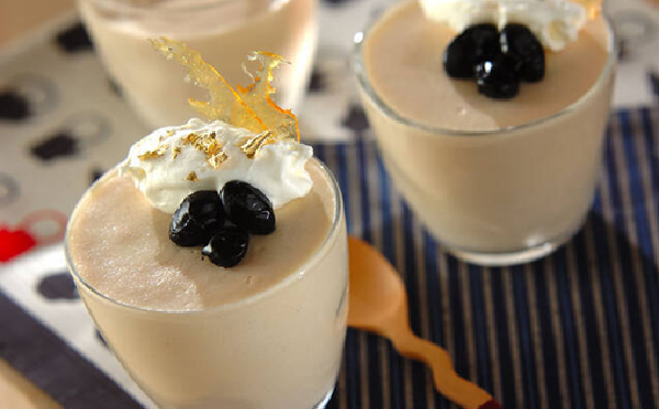 ほうじ茶の香ばしさが広がるムースに、黒豆をトッピングした一品。金箔やべっ甲飴を添えるとより上品なビジュアルに。和スイーツらしいやさしい風味で、食後のデザートにも最適です。