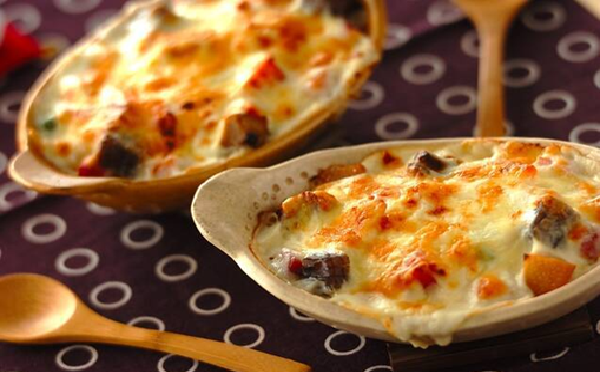 お煮しめをドリアの具材に使う、斬新アレンジ。おせちで残ったエビやハムなども具材に混ぜ込みましょう。ご飯にしょうゆを混ぜることで、和風テイストに仕上がりますよ。ホワイトソースは大量に作って冷凍保存しておくと、ほかの料理でも使えて便利です。