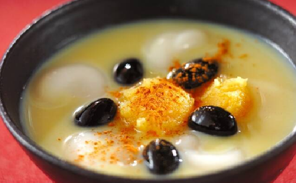 栗きんとんを牛乳で煮たお汁粉は、ありそうでなかった一品。シナモンの香りがアクセントになったクリーミーな味わいは、やみつきになること間違いなしです。仕上げに添える黒豆は、おせちの残りを活用しても、もちろん◎。