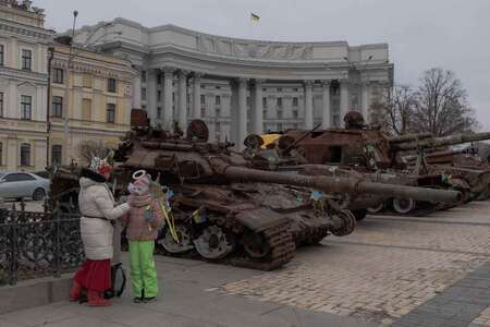 〔写真説明〕破壊されたロシア軍の戦車が置かれたキーウの広場=2025年12月25日、ウクライナ(AFP時事)