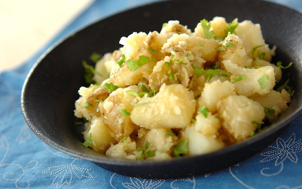 ナンプラーの旨みとパクチーの香りがくせになる、少し個性的なアレンジ。蒸したジャガイモはあえて粗めにつぶすことで、バターがよく馴染み、素材の食感も楽しめます。すりおろしニンニクのパンチが効いているので、ビールやハイボールのおともにも最高です。