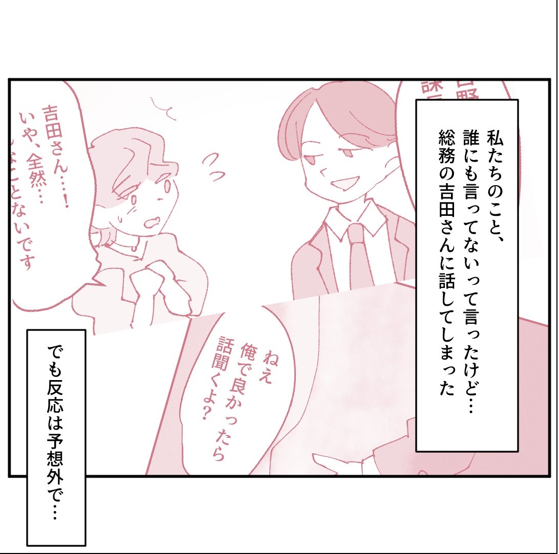 聡から「俺らの話、誰にも言ってないよな?」と問われ、思わず否定してしまったユキ。しかし実は、同僚の吉田には話してしまっていました。