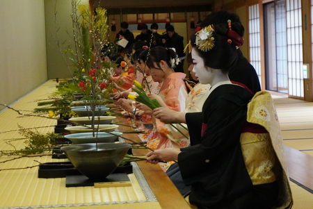 〔写真説明〕初生け式で花を生けるもみ智さんら=5日、京都市中京区