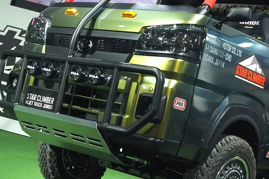 ダイハツが用意したハイゼットトラック「ジャンボ スタークライマー」は、大径タイヤを履いて車高がリフトアップされているほか、大胆にもルーフパネルやフロントガラスを取り去り、着脱式のロールバーを装着しているのが特徴。また、トヨタが製作したピクシストラックのカスタムモデルについても、同社の本格4WD「ランドクルーザー300」を思わせるフロントバンパーなどが個性的な印象です。