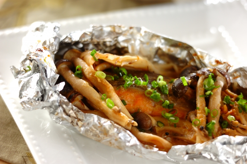 ホイルを開けたとき、上にのせているキノコ類(シメジとマイタケ)がしんなりしていれば焼き上がりです。