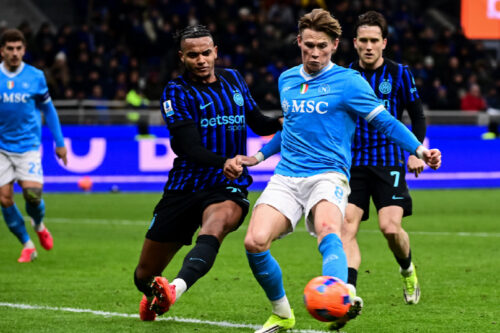それでも81分、指揮官を失ったナポリが同点弾を挙げる。ペナルティエリア正面でジョヴァンニ・ディ・ロレンツォがこぼれ球を拾い、ボックス右角で待つマッテオ・ポリターノに配球。左足で柔らかいクロスを蹴り入れると、ボールは混戦を抜けて大外のノア・ラングにわたる。ワンタッチで送ったマイナスの折り返しにマクトミネイが反応。ダイレクトで合わせてナポリが再度追いついた。