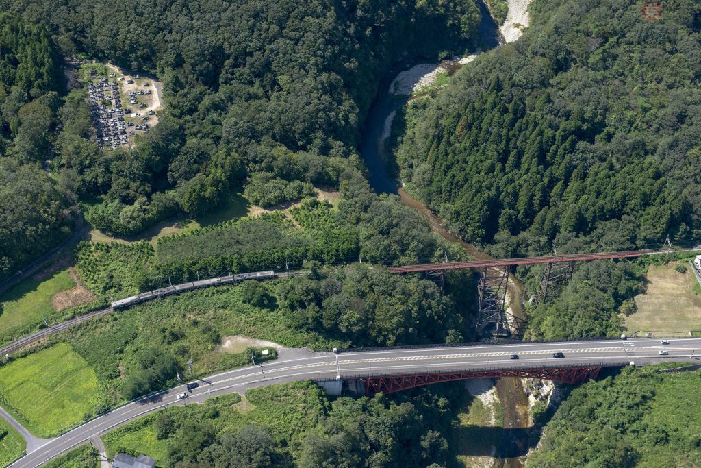 東京都は2か所あり、その1か所はJR青梅線の軍畑駅付近に架かる奥沢橋梁です。以前の「空から撮った鉄道」でも紹介した橋梁で、前身である私鉄の青梅鉄道時代に架橋されました。