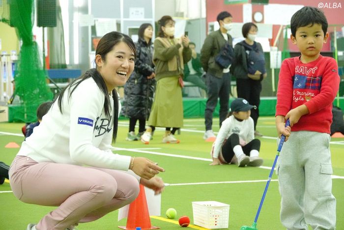 21年には東京五輪で銀メダルも獲得した、20-21シーズンの国内ツアー女王は、元気な子どもたちとの触れ合いに終始、笑顔。「楽しませられるか不安だったけど、みんなエネルギッシュでした。小さい子たちに教えたりすると、自分が大人になった気分ですね」と、充実感も覚える時間になった。「子どもたちが飽きないように」ということを目指し、レッスンだけでなく、的当てゲームや、トーク、抽選会など趣向も凝らした。