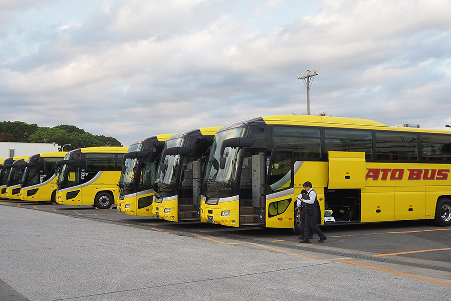 バスがはとバス本社の車庫に着くと、黄色いバスが並んでいる中で伊豆箱根バスの白い車体は否が応でも目立ちます。面白いのは伊豆箱根バスの日野「セレガ ハイデッカ」が駐車した際、同じジェイ・バス小松工場(石川県小松市)で製造されたため見た目がそっくりな、はとバスの日野自動車の「セレガ ハイデッカ」が隣同士になったことです。