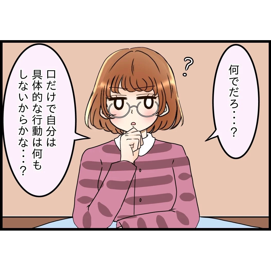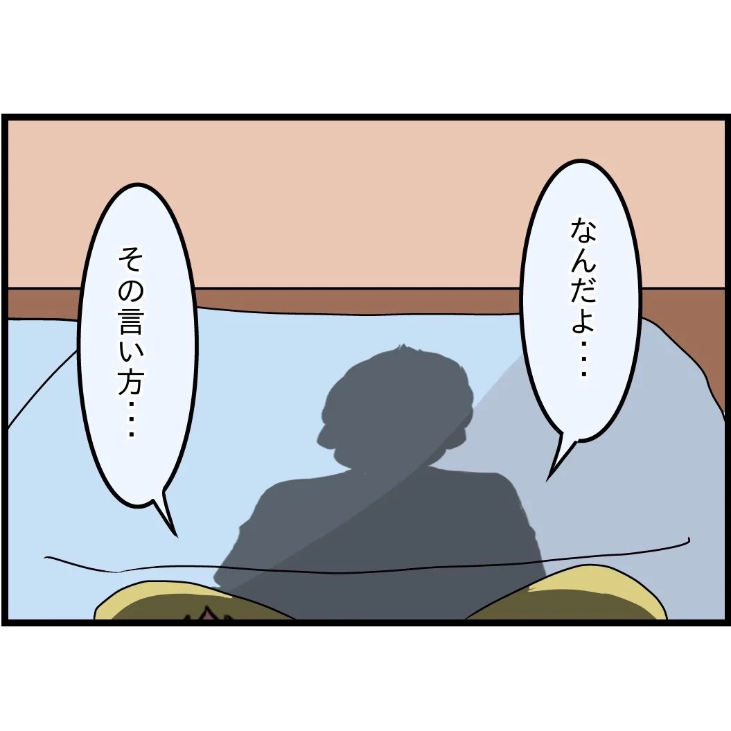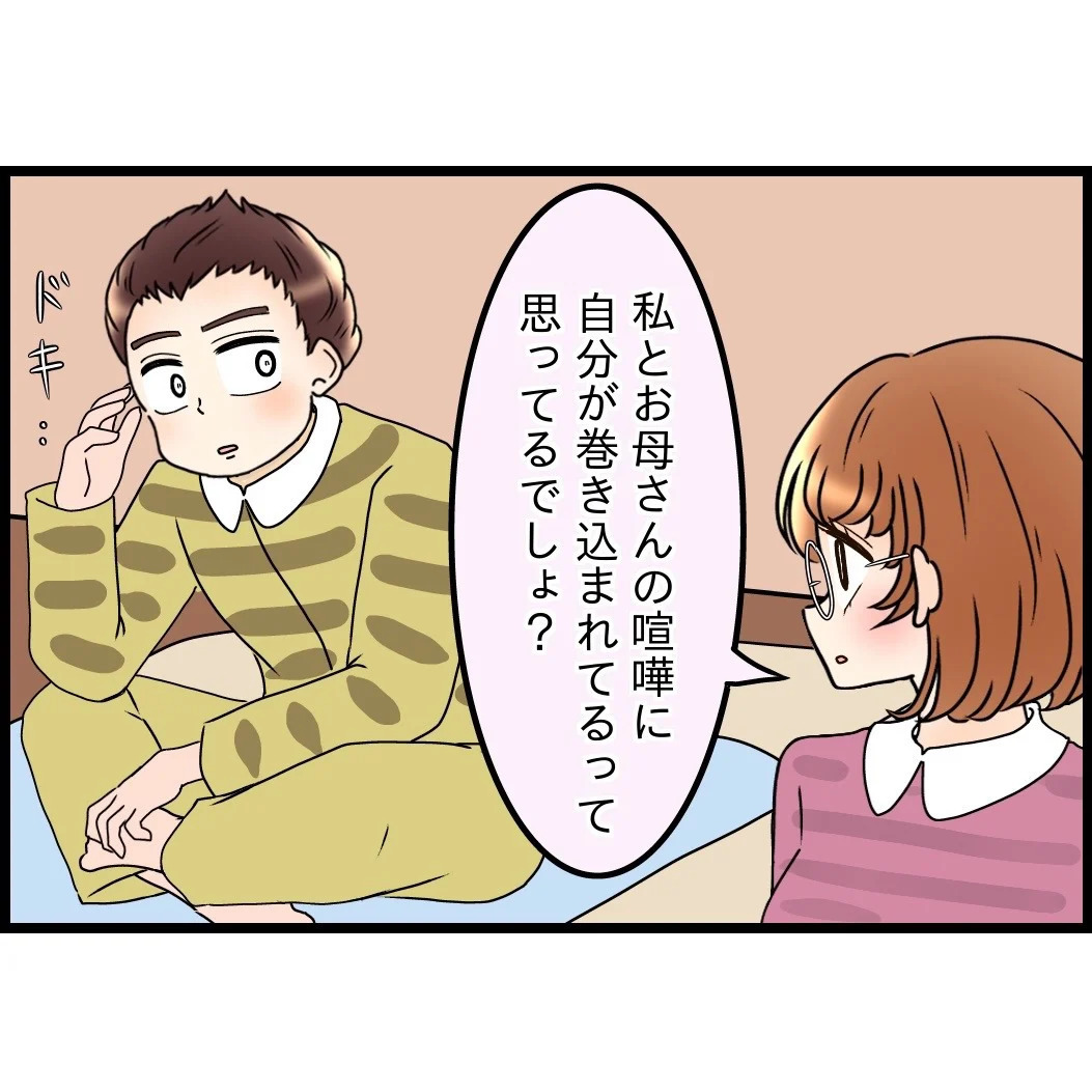 妻から「親孝行を私にやらせるな」と突っぱねられてしまった夫。慌てて妻をフォローしはじめ、いつものように一連の嫁姑問題について自分はどちらの味方にもついてないような立場を見せる…