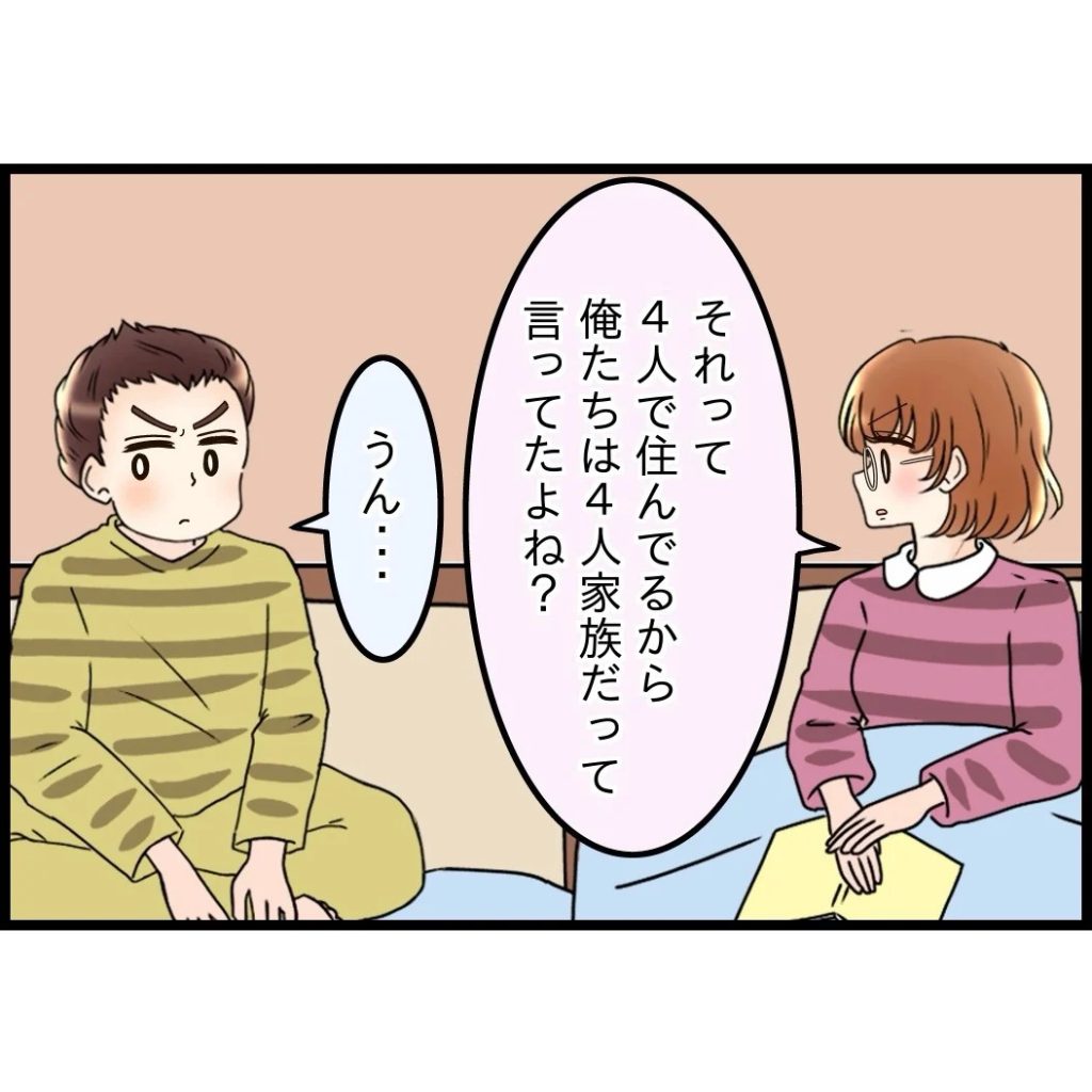 夫は嫁姑問題に対して当事者意識をもっているのかいないのか。夫婦の意見が平行線をたどるなかで妻は、夫が自分たちを「4人家族」だと言い張る理由をあらためて確認する…