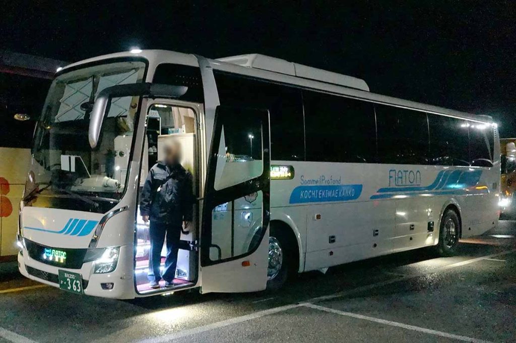 それでは乗車します。フラットンが高知駅バスターミナルに19時25分頃入ってきました。出発は19時40分です。