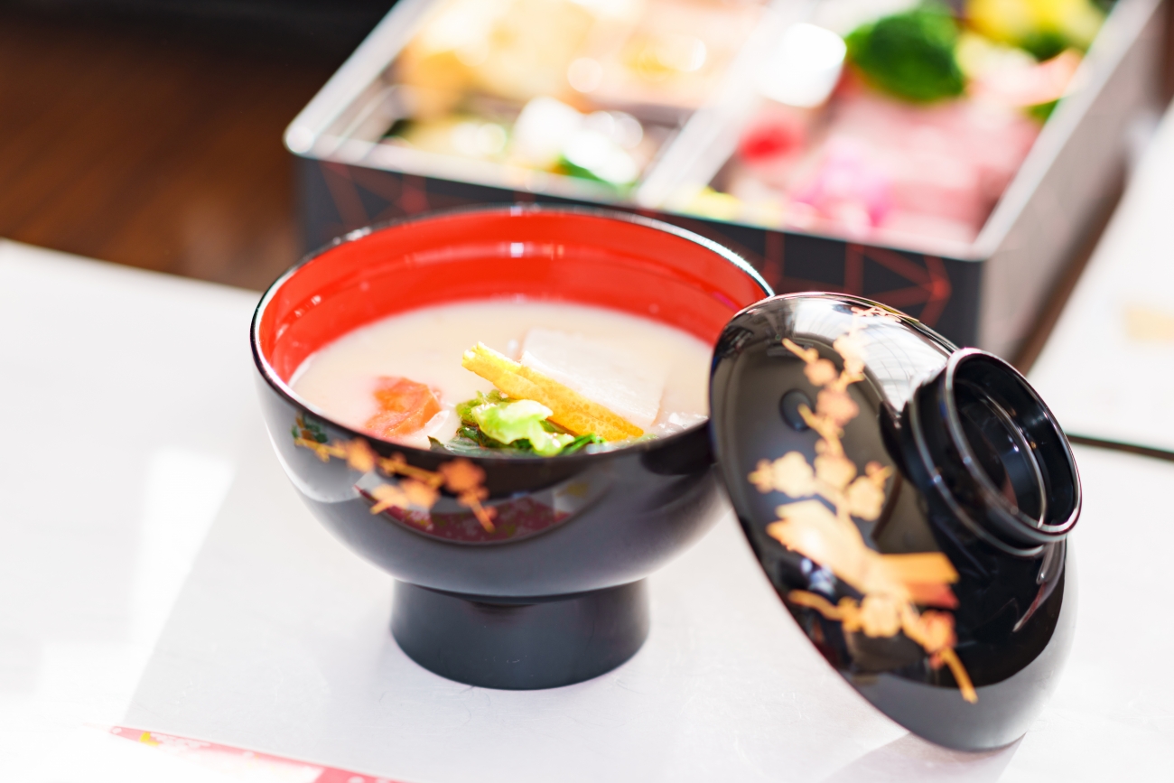 2、里芋、丸餅を入れ、丸餅が柔らかくなったら、白みそを溶き入れる。お椀に盛って、糸かつお、柔らかめに溶いたからしをのせる。(ヒント)お餅が固い場合は、サッと水でぬらして耐熱容器にのせてラップをかけ、電子レンジで様子を見ながら、柔らかくして鍋に入れて下さい。