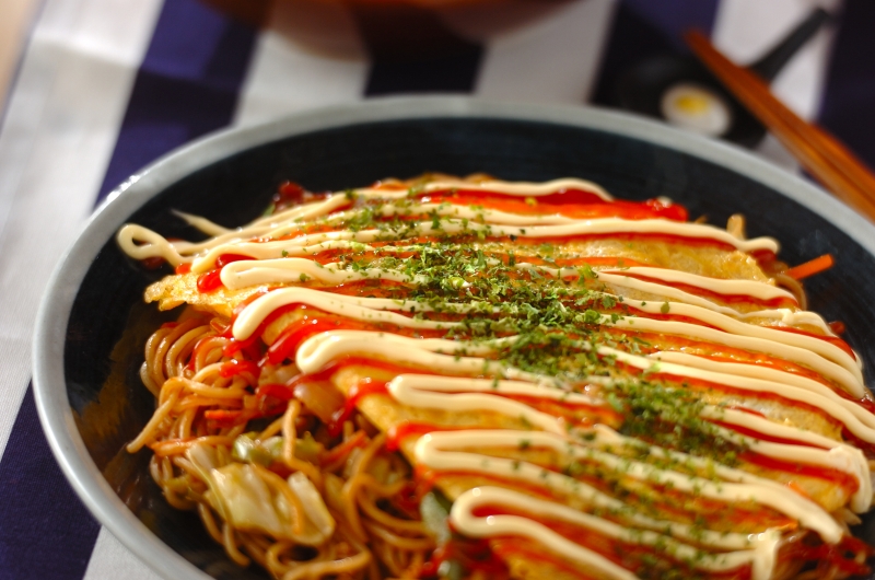 いつもの焼きそばに一工夫。薄焼き卵の上にケチャップやマヨネーズで好きにデコっても楽しいですね。