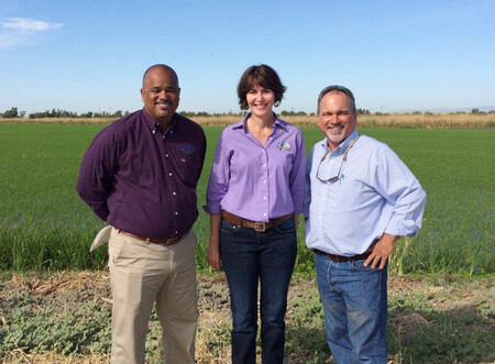 〔写真説明〕米カリフォルニア州のコメ農家ニコル・バンブレックさん(中央)(同氏提供)