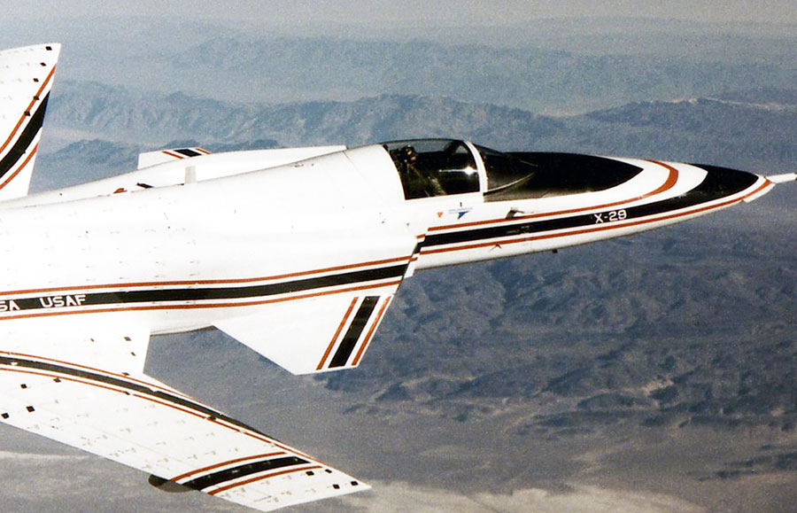 X-29はグラマンが開発した前進翼機で、前方に向けて傾斜をつけて取り付けられた主翼が特徴です。試作機は2機製造されました。