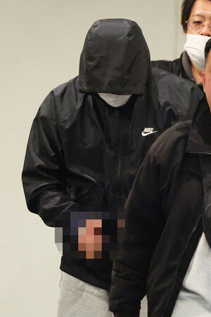〔写真説明〕奄美大島から羽田空港に移送された違法スカウトグループ「ナチュラル」トップの小畑寛昭容疑者=27日午後(一部画像処理しています)