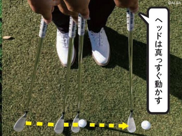 スタンス幅はヘッド1個分。また、ツマ先からボールまでの距離はヘッド3個分が基本です。パターのように握ったらボールはスタンス中央に置き、シャフトは真っすぐに構えましょう。そのまま上体の回転でヘッドを真っすぐ動かすことを意識してください。