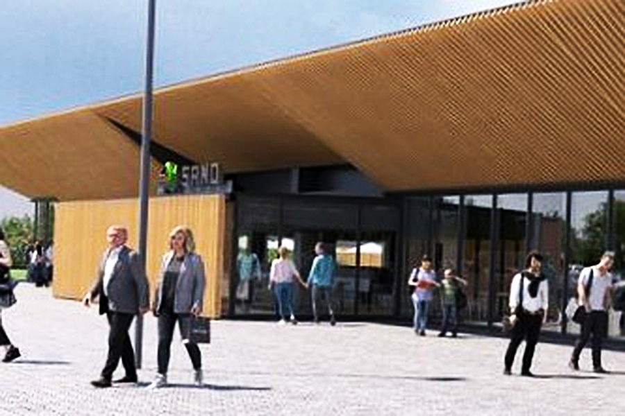 新しい佐野SA上り線は、商業棟の内外装デザインを隈研吾建築都市設計事務所が監修しました。外観では、木材が並べられたスリット状の軒部分が目を引きます。施設面積は約1693平方メートルで、EV急速充電器4基なども備えます。