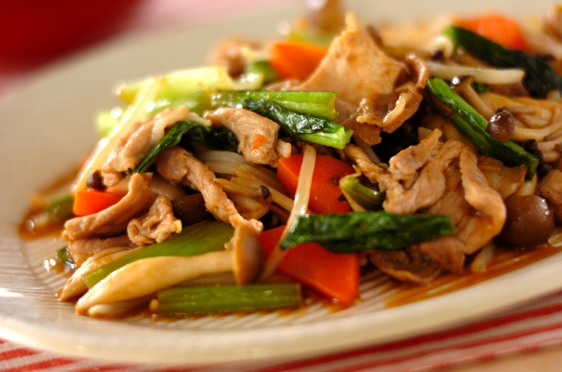 2. フライパンにサラダ油を足し、小松菜の茎、シメジ、ニンジンを入れて強火で炒める。豚肉を戻し入れ、 小松菜の葉とモヤシ、焼き肉のタレを加え、手早く炒め合わせて器に盛る。