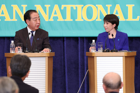 〔写真説明〕日本記者クラブ主催の党首討論会で高市早苗首相(右、自民党総裁)に質問する中道改革連合の野田佳彦共同代表=26日、東京都千代田区