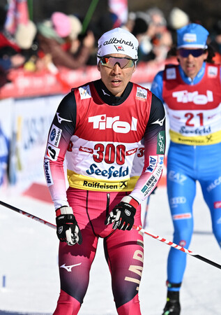 〔写真説明〕ノルディックスキー複合のワールドカップで、通算300試合に到達したことを示すゼッケンを着用した渡部暁斗=1月30日、オーストリア・ゼーフェルト(AFP時事)