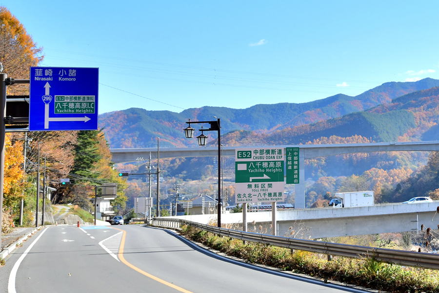 そのルートは、中央道の長坂ICに接続する長坂JCTから北上し、山梨県側に高根IC、清里IC、長野県側に野辺山IC、海ノ口IC、小海IC(いずれも仮称。以下同)と5つの途中ICを設け、八千穂高原ICまでをつなぎます。概ね国道141号に沿いますが、中央道側は双葉JCTや須玉ICに接続させると山岳部を貫く線形となるため、双葉ICから約20km離れた長坂IC付近が起点となりました。