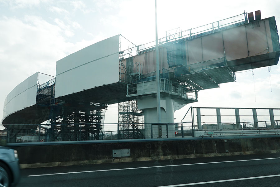 この橋は伊勢湾岸道と、その下で交差する国道247号「西知多産業道路」をつなぐため、新たに4本建設されるランプのうちの一つ。このJCT工事を含め、伊勢湾岸道と常滑市の知多横断道路を結ぶ「西知多道路」18.5kmの建設が進んでいます。