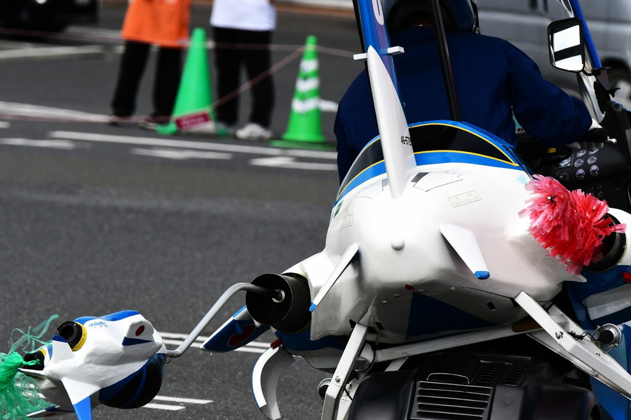 当初は廃車になったバイクを改造して活動していましたが、その後ブルーインパルスジュニアは正式なクラブ活動へと昇格。現在はホンダの3輪スクーター「ジャイロキャノピー」をブルーインパルスT-4風にカスタムした車両6台で活動しており、各地のイベントでは実機さながらの高度な操縦テクニックを披露しています。