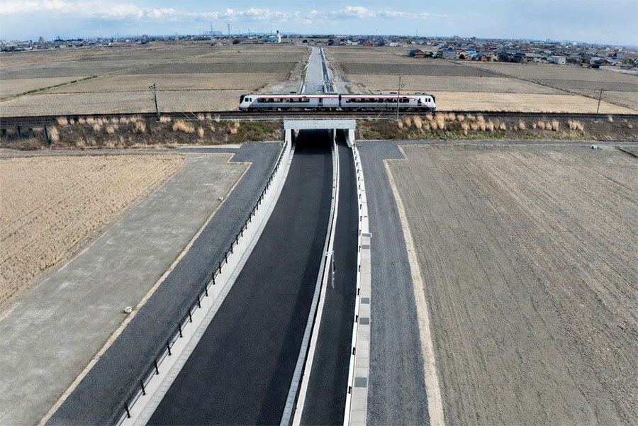 「磯山バイパス」は海沿いの国道23号(近鉄磯山駅近く)から内陸へ、国道23号「中勢バイパス」までをつなぐ3.5km。2015年開通のI期区間から12年を経て、II期区間1.7kmが開通して全通します。この区間では伊勢鉄道の築堤をアンダーパスします。