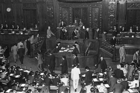 〔写真説明〕衆院本会議で、スパイ防止法案の記名投票を行う議員ら。賛成多数で継続審議となった=1985年6月、国会内