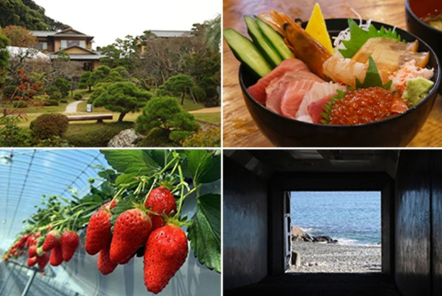 集合場所は伊勢原駅改札口(9時20分)。平塚の「すぎやまいちご園」では、約10品種のいちご食べ比べが予定されているほか、大磯では旧吉田茂邸をガイド付きで見学。昼食は早川漁港の海舟海鮮丼となり、小田原を代表する絶景ビーチ「御幸の浜」や「かまぼこ通り」、「一夜城ヨロイヅカファーム」などにも立ち寄る行程となっています。