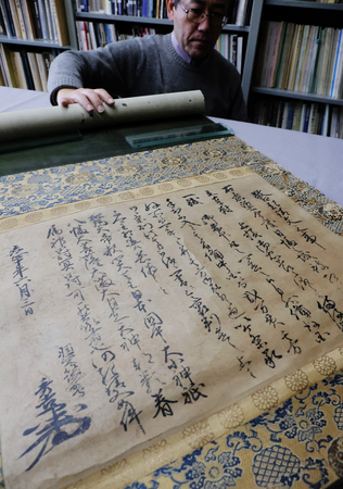 〔写真説明〕ネットオークションで発見され、初公開される羽柴秀吉の起請文=3日、水戸市