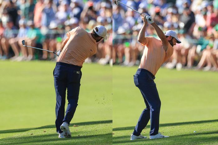 これまでボクはスイングでは、体を足裏の四点で支えている、と教えてきました。四点とは両足それぞれのツマ先とカカトです。ところが、そもそもコース全体がアンジュレーションのきついオーガスタでは、ときに三点、あるいは二点、状況によっては一点で立つ、それもドッシリと立つことが求められるのです。たとえばアーメンコーナー最後の13番パー5。2オンを狙うセカンド地点は、大きなツマ先上がり&左足下がりの複合傾斜。通常、このライではフックボールが出やすく、しかもロングアイアンで打つしかない。ピンが右に切られた場合、優勝したスコッティ・シェフラーなどは高いフェードで、右サイドを狙ってくるのです。思うに右足を宙に上げるくらいの意識で、左足カカト一点で立っているのではないでしょうか。