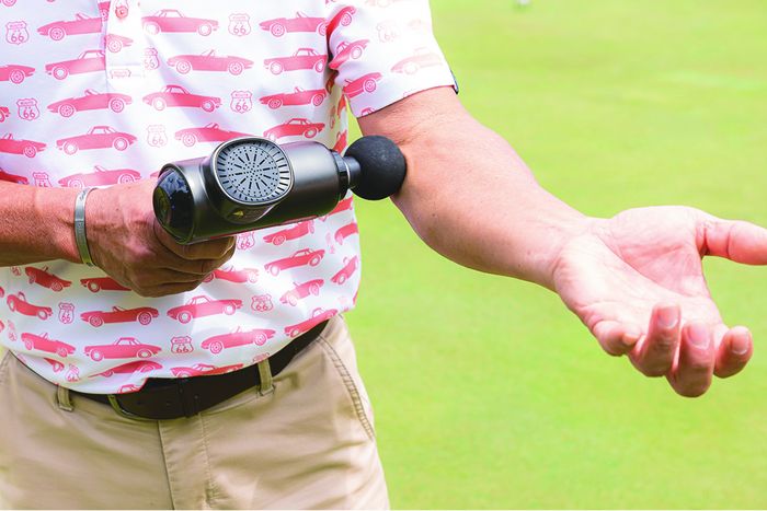 家電量販店などで、見かけるようになったマッサージガン。銃のような形状をしたハンディタイプの電動マッサージ器具で、ヘッド部分のアタッチメントが高速振動し、筋肉や筋膜を刺激。コリや痛みの元にアプローチして、血行促進や疲労回復などの効果が得られるとされている。好きなときに手軽に使えるため、ゴルフ前後のケアにも重宝する。