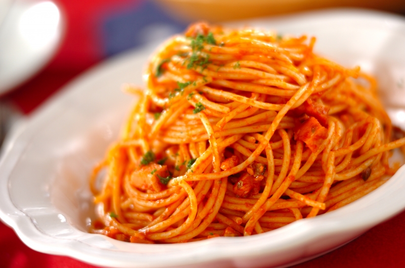 アンチョビ、オリーブ、ケイパー、唐辛子入りのトマトソースで和える大人味のスパゲティー。