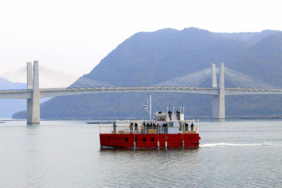 発着港となる日生港はJR赤穂線日生駅の目の前に位置し、お好み焼きに牡蠣をふんだんに入れて焼き上げる名物“カキオコ”でも知られます。この好立地を生かし、今後JRとのコラボも企画できるほか、この船は日本小型船舶機構が明示している「平水域」で航行できることから、その区域である四国・高松や岡山沿岸へも航行可能。定期的に開催される瀬戸内国際芸術祭での活躍も期待できるといいます。