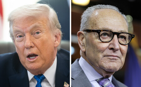 〔写真説明〕米国のトランプ大統領(左)と民主党のシューマー上院院内総務(EPA時事)