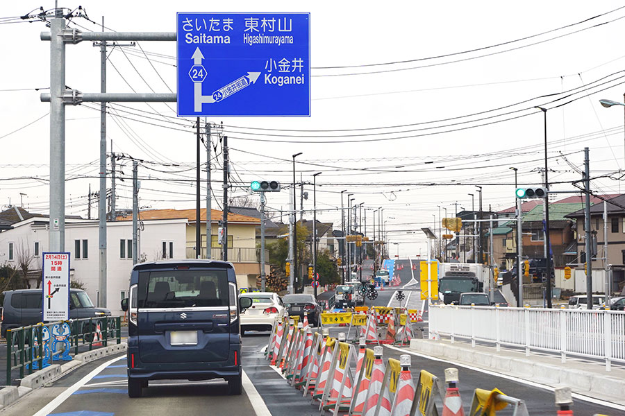 今回開通するのは、東京都清瀬市と埼玉県所沢線の都県境をなす柳瀬川に架かる清瀬橋から東京側へ、志木街道を経て新小金井街道に至る約1.6kmの区間です。これに伴い、清瀬橋に通じていた従来の小金井街道も線形が変わり、新東京所沢線が清瀬橋へ通じる「本線」となります。清瀬橋から先は「東京狭山線」と呼ばれ、4車線の幹線道路が所沢市、狭山市方面へ通じています。