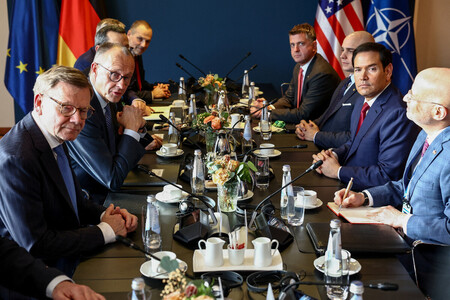 〔写真説明〕ドイツのメルツ首相(左から2人目)と会談するルビオ米国務長官(右から2人目)=13日、独南部ミュンヘン(AFP時事)