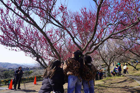 梅林は、南高梅など約8万本が植えられており、赤や白の花がかれんに咲き誇る。梅の里観梅協会によると、今年は平年より1週間ほど早く開花したという。天候にもよるが、見頃は今月中旬まで続く見込み。