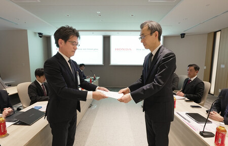 〔写真説明〕ホンダの貝原典也副社長(右)に2026年春闘の要求書を提出する同社労働組合の中央執行委員長(左)=18日、東京都港区(同社提供)