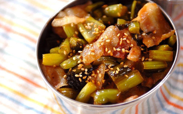 冷蔵庫にあるものでサッと作りたいときに重宝する、シンプルながらも奥深い丼です。豚バラのジューシーな脂と、野沢菜のほど良い塩気が相性抜群。炒めることで野沢菜の旨みが凝縮され、お弁当のメインおかずとしても喜ばれる、冷めてもおいしい一品です。