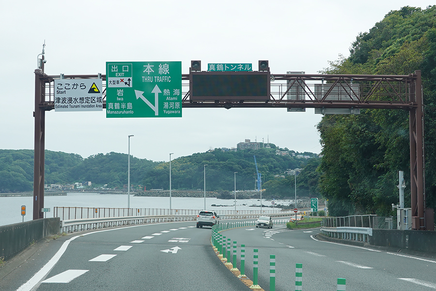 真鶴道路は小田原市と湯河原町を結ぶ国道135号の有料バイパスです。小田原から静岡県熱海にかけて海沿いをゆく135号の現道は、内陸寄りのJR真鶴駅周辺市街地を通りますが、真鶴道路は海に張り出した橋とトンネルで狭隘な区間をバイパスします。