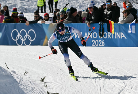 〔写真説明〕ノルディックスキー距離・女子50キロクラシカルで力走する土屋正恵=22日、テーゼロ(AFP時事)