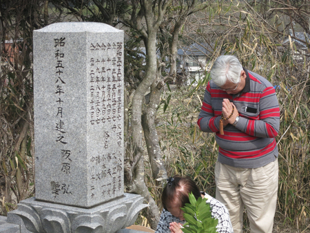 〔写真説明〕阪原弘さんの墓に手を合わせる長男弘次さん(奥)と長女美和子さん=2023年3月1日、滋賀県日野町