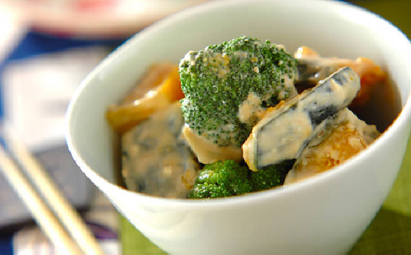 みそ&クリームチーズという意外なコンビが、野菜の甘みをグッと引き立てます。ほっくりとしたブロッコリーとカボチャに、まろやかな和え衣がしっかりとからみ、食べ応えも抜群。和食にも洋食にも合わせやすく、使い勝手の良い副菜です。