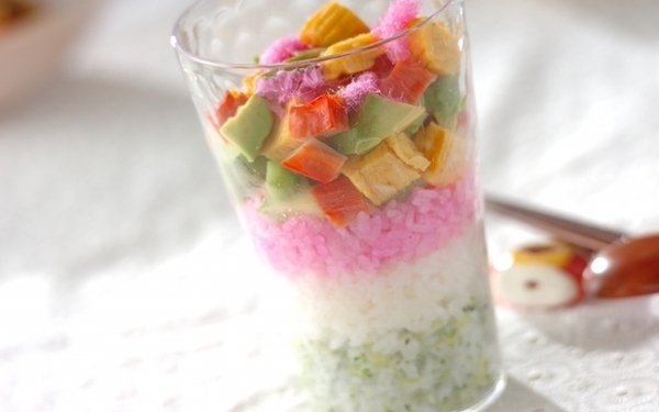 一人前ずつ盛り付けるカップスタイルなら、小さな子どももこぼさず上手に食べられますよ。3色の酢飯を層にしたミルフィーユ仕立てで、横からの見た目もバッチリ。カニカマや卵焼きなど大好きな具材を贅沢にのせていただきましょう。