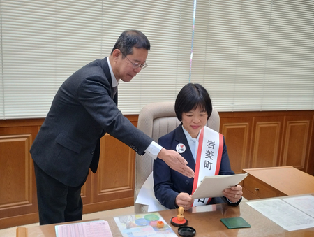 女性は長戸清町長から辞令交付とたすき授与を受けた後、模擬書類に判を押す決裁業務を体験。その後、町ケーブルテレビで放送する町民へのあいさつを収録し、町議会議場など役場庁舎を見学した。夜には町内にある旅館で温泉やカニ料理を味わう予定だ。